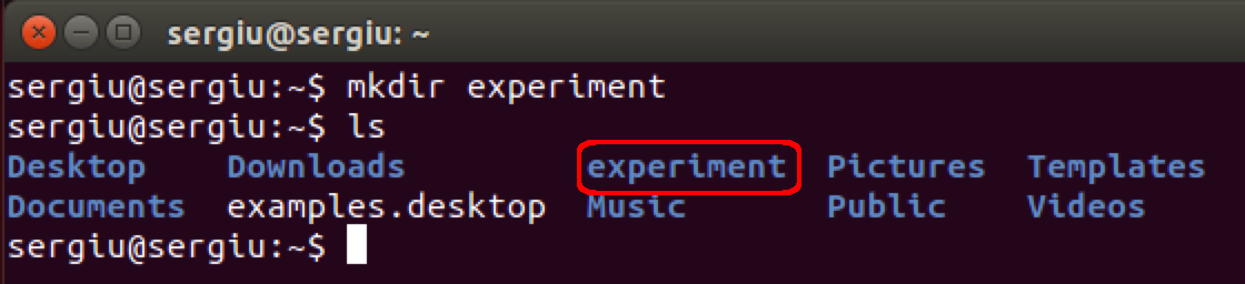 Pentru a oferi complexitate comenzilor executate din terminal acestea au nevoie de parametri adiționali care urmează imediat după comandă. Comanda mkdir este folosită pentru crearea directoriilor. Dacă observi această comandă este următă cu cuvântul experiment. Aceasta nu este nimic altceva decât numele directoriului care doresc să îl creez, în același timp experiment este parametrul adițional transmis comenzii mkdir. Pentru a mă asigura că comanda a fost executată cu succes și că directoriul a fost creat execut încă odată următoarea comandă: